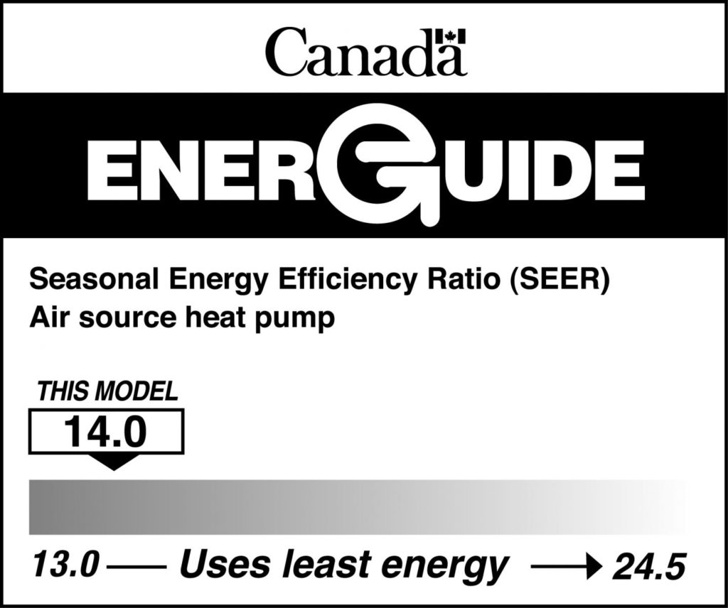 EnerGuide is Canada’s energy efficiency labeling program and rating system for major appliances including room air conditioners and central AC units. This voluntary label displays the model type and SEER rating of different cooling systems.